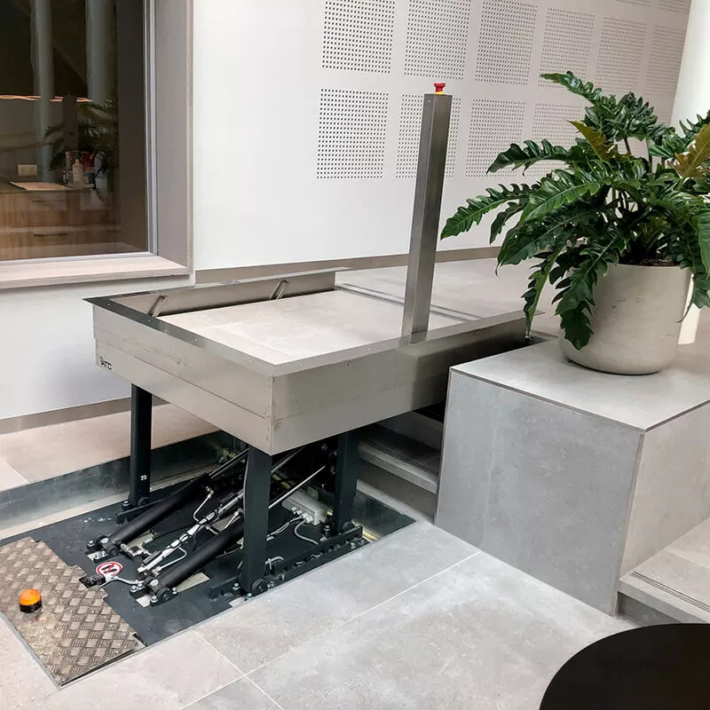 - Fundamentaussparung: Bei einigen Modellen ist eine Fundamentaussparung von einigen Zentimetern notwendig, um die Hebebühne ebenerdig befahrbar zu machen.
