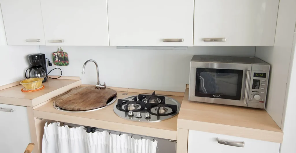 - 1 Offener Wohnbereich mit Küchenzeile. Der Arbeitsbereich Spülen/ Kochen ist unterfahrbar.
