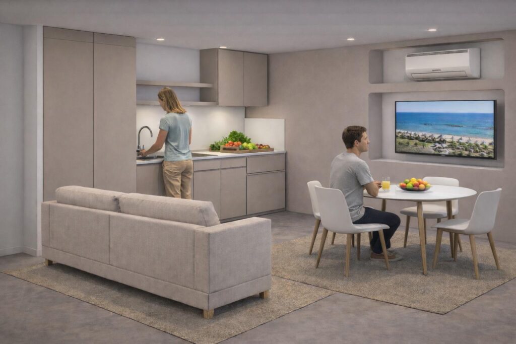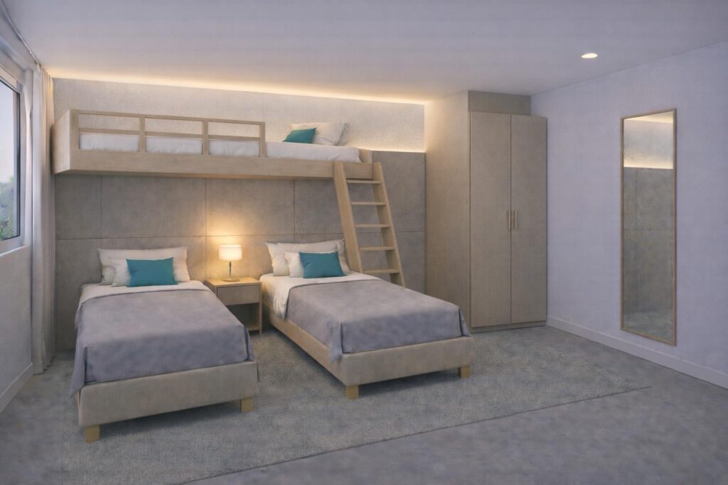 Wie bereits erwähnt wurden für die Saison 2026 diese Suiten mit den barrierefreien Badezimmer neu konzipiert. Neue Fotos dazu liegen leider noch nicht vor. Untenstehend können wir zum jetzigen Zeitpunkt Animationfotos der Wohn- und Schlafräume vorstellen: