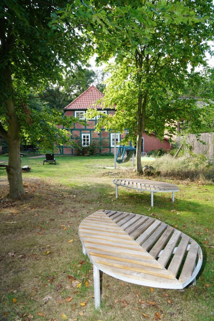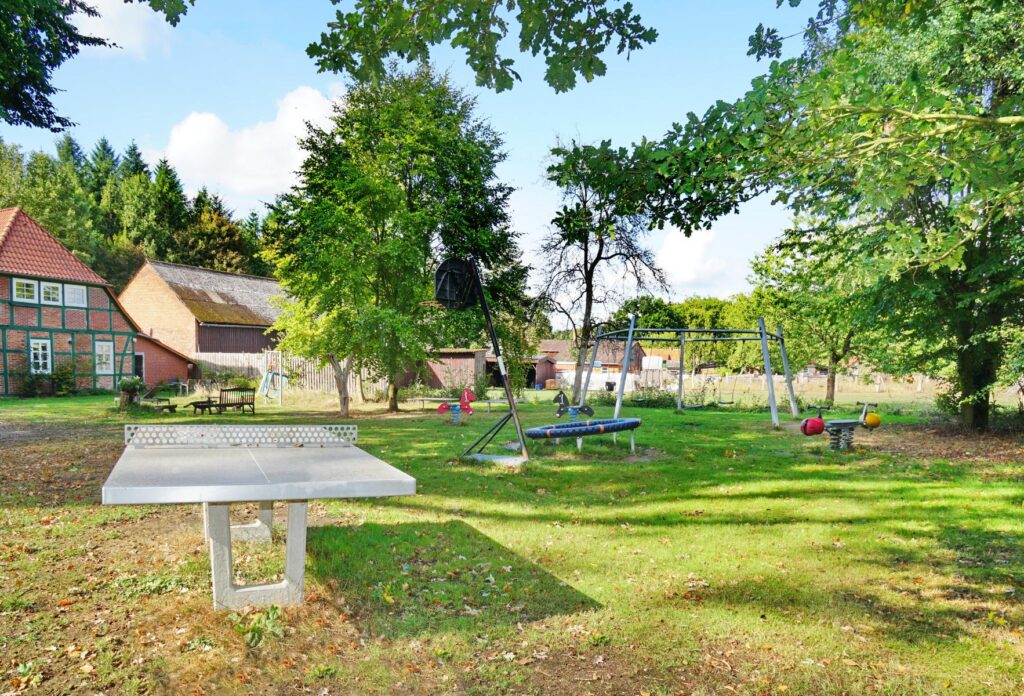 Trampolin, Go-Karts, Sandkiste, einen Hasenstall, einen kinderlieben Hofhund, eine Hofkatze, eine Streichelweide mit: Heidschnucken, einem Esel, Ziegen und Shettys (keine Reitpferde).