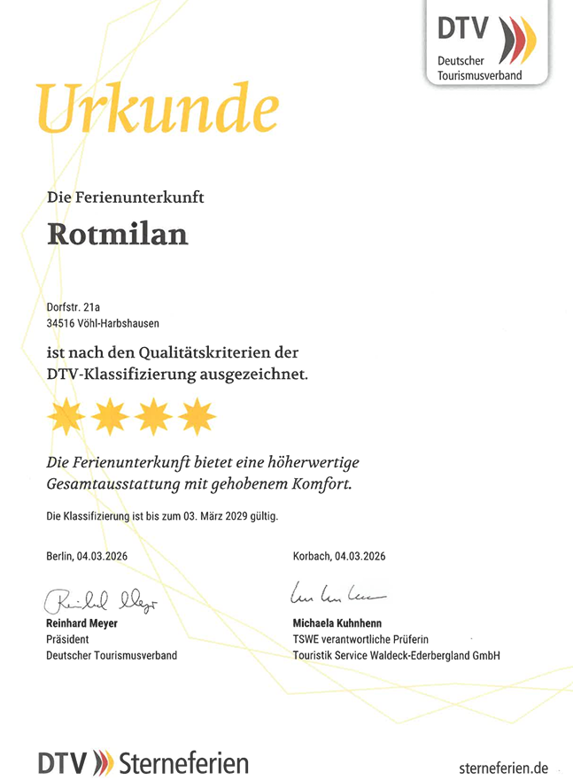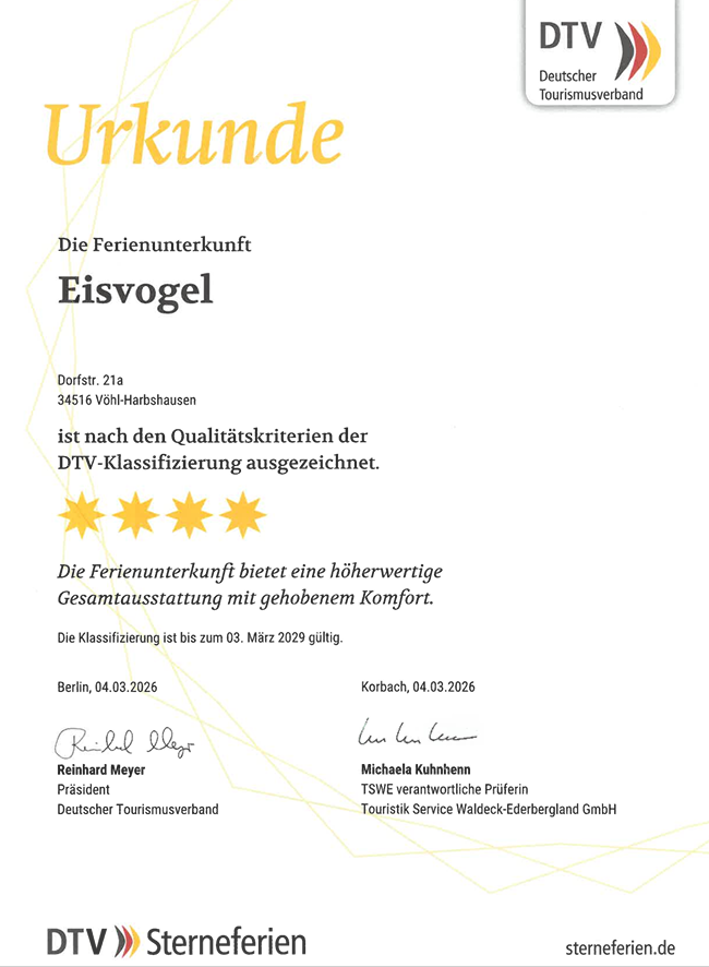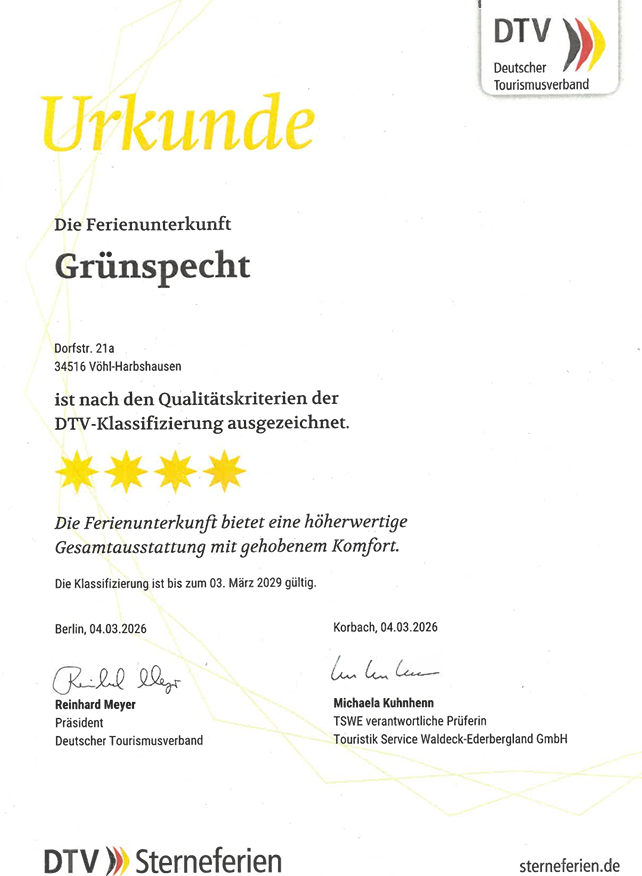 Alle 3 Ferienhäuser sind nach den Qualitätskriterien der DTV-Klassifizierung mit ****Sterne ausgezeichnet: Diese Ferienunterkünfte bieten eine höherwertige Gesamtausstattung mit gehobenem Komfort