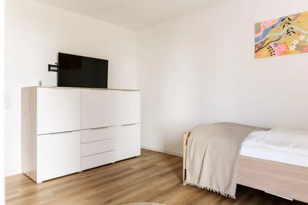 In dem zweiten Zimmer befindet sich ein Einzelbett das ebenso mit einer hochwertigen Matratze, einem Kleiderschrank und Smart-TV ausgestattet ist. Dieses Einzelbett ist höher gestellt und unterfahrbar. Dank der ruhigen Lage ist ein erholsamer Schlaf in beiden Schlafzimmern garantiert.