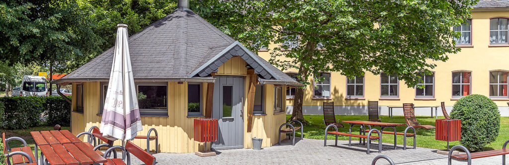 Die Cafeteria befindet sich im Obergeschoss und ist natürlich, wie alle unsere Räumlichkeiten, barrierefrei zugänglich und bietet somit einen tollen Ausblick über die komplette Anlage. Hier kann man bei einer Tasse Kaffee und einem leckeren Stück Kuchen eine Pause einlegen oder auch neue Kräfte sammeln, bevor man einen Ausflug in die Umgebung startet.