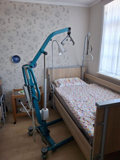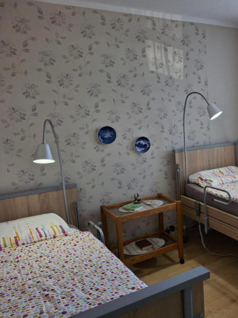 - Beide Betten (mobil, elektrisch verstellbar) sind mit Lampe, Aufrichthilfe und Seitengitter ausgestattet