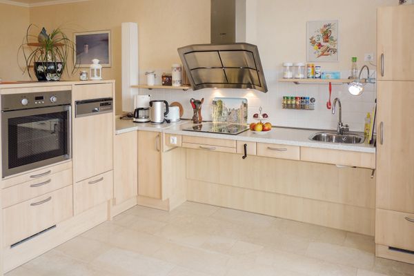 - Der Arbeitsbereich in der Küche mit Spüle und Kochfeld ist unterfahrbar und höhenverstellbar