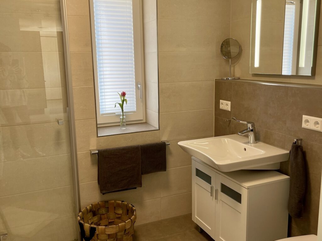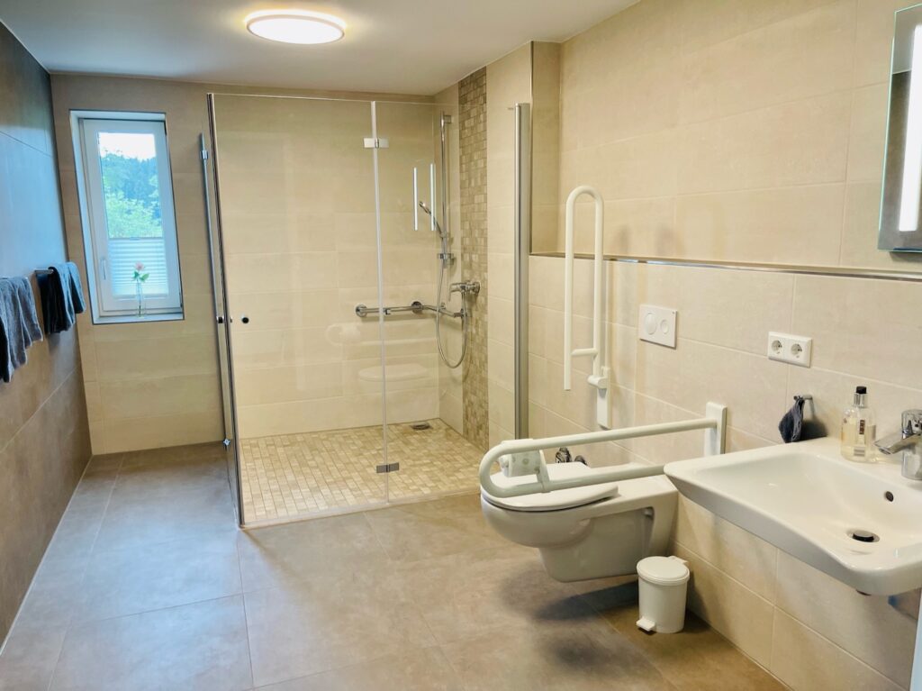 Das Badezimmer ist ein Tageslichtbad. Das Badezimmer ist für Menschen mit Gehbehinderung und Rollator fahrende Gäste konzipiert und bietet ausreichend Freiräume.