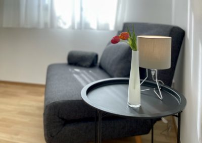 Zum Wohnzimmer hin befindet sich der Flur mit dem Eingangsbereich. Dieser ist großzügig gestaltet und bietet ausreichende Freiräume zum Fahren und Wenden. Das helle Wohnzimmer bietet neben dem Balkon ein modernes Flachbild TV, einen Schwedenofen und W-LAN.