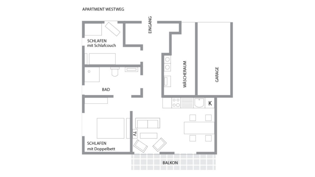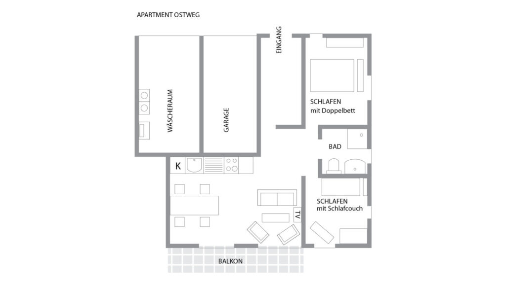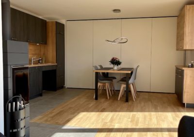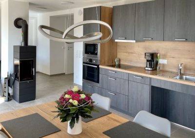 Die Küche und das Wohnzimmer bilden einen offenen Bereich. Dadurch ist auch die Kommunikation untereinander gegeben. Der offene Raum wird durch die großzügigen bodentiefen Fenster und Türe lichtdurchflutet. Ausgestattet ist die Küche mit Induktionsherd, Toaster, Filterkaffeemaschine, Spülmaschine, Kühlschrank mit Gefrierfach, Eierkocher, Mikrowelle & Backofen.