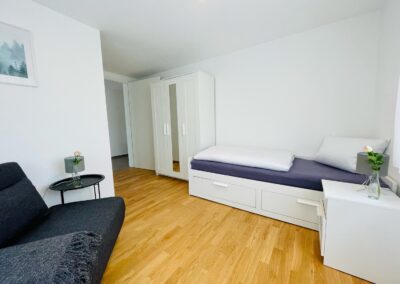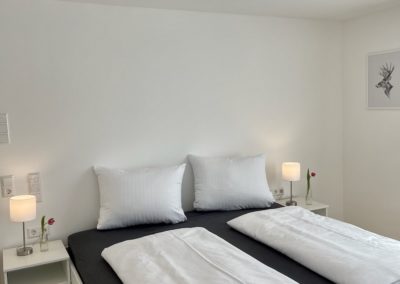 Es sind zwei Schlafzimmer vorhanden. In dem Hauptschlafzimmer ist ein Doppelbett 180 x 200 cm. Im zweiten Schlafzimmer befindet sich ein Einzelbett mit 80 x 200 cm und eine Schlafcouch mit 100 x 180 cm