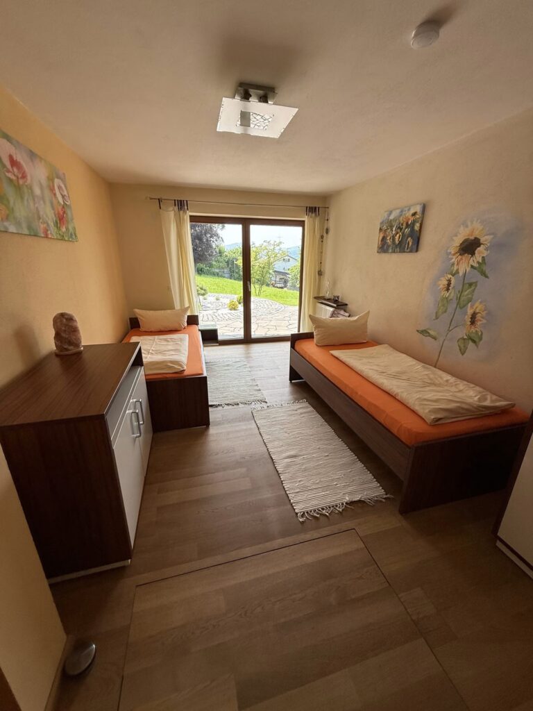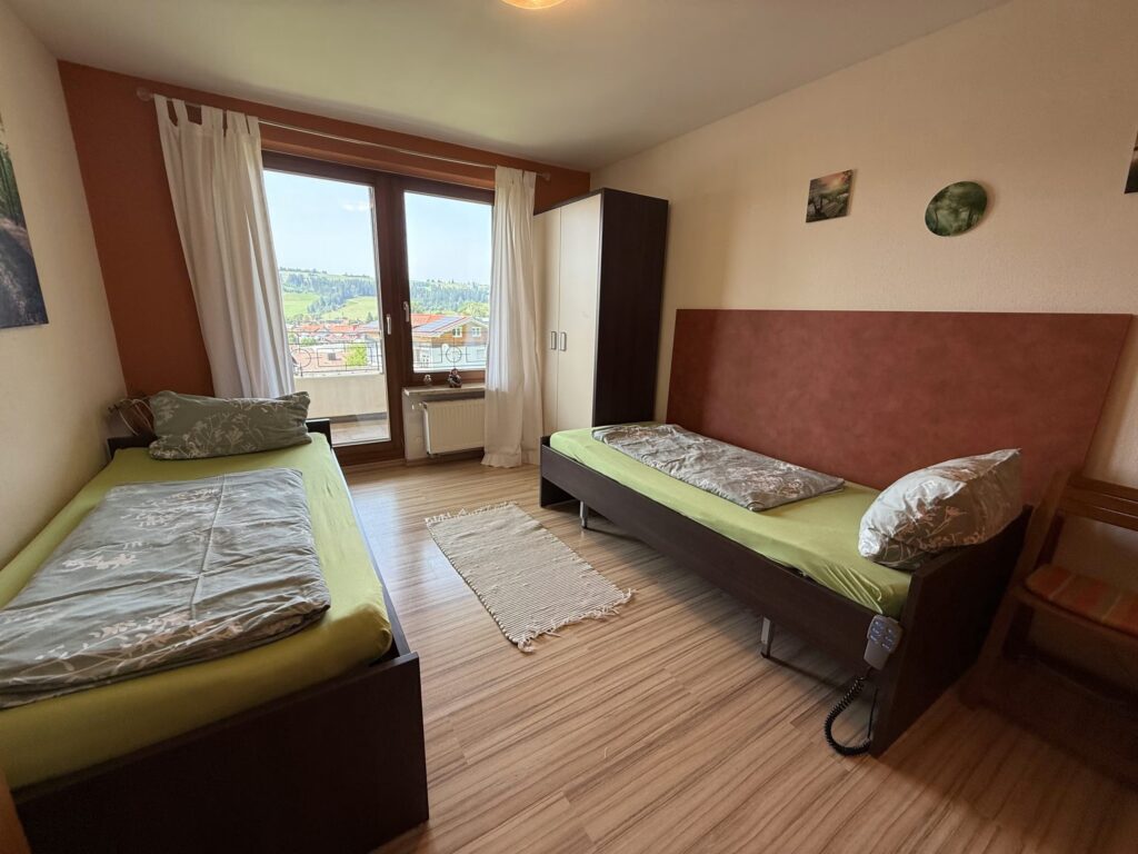 Die Wohnung Lichtblick bildet das mittlere Stockwerk des Ferienhauses. Dank der besonderen Hanglage in Weiler Simmerberg zählt sie zu den barrierefreien Unterkünften die von außen komplett ebenerdig befahrbar sind.